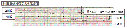 測量兩個方向上的預(yù)加載扭矩,預(yù)緊動態(tài)扭矩的標(biāo)準(zhǔn)值可以保證出貨品質(zhì)?!緢D2】是預(yù)緊扭矩= 20.6至37.2 N·cm。