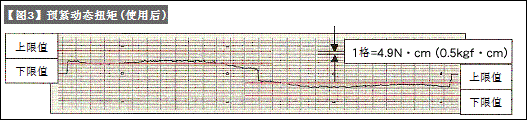【圖3】表示的預(yù)緊動態(tài)扭矩圖表是【圖2】所表示的滾珠絲杠經(jīng)過長時間使用的結(jié)果,因?yàn)闈L珠絲杠的磨損等,預(yù)緊低下時候測定的預(yù)緊動態(tài)扭矩?cái)?shù)據(jù)。測定值為9.8至24.5N·cm,與出貨時的初始值相比降低了30至40%。