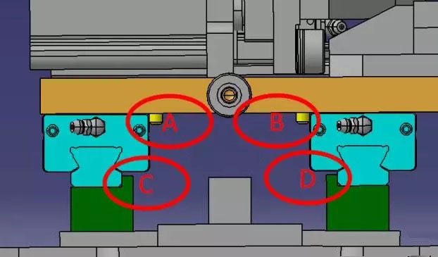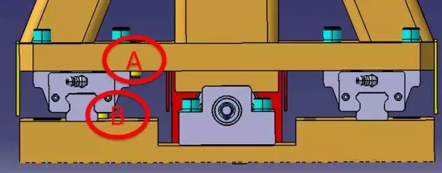 紅色圈B: 所指滑軌位置為定位基準(zhǔn),采用定位銷定位