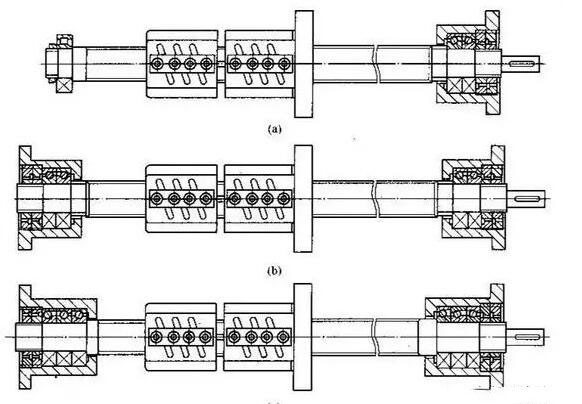 c)所示是兩端固定的支承形式,絲桿的軸向剛度約為一端固定形式的4倍,可預(yù)拉伸,這樣既可對(duì)滾珠絲桿施加預(yù)緊力,又可使絲桿受熱變形得到補(bǔ)償,保持恒定預(yù)緊力,但結(jié)構(gòu)工藝都較復(fù)雜,適用于長絲桿。