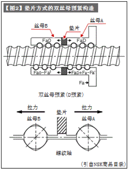4、墊片方式:在兩個(gè)絲母構(gòu)造之間加入預(yù)緊量的墊圈(墊片)進(jìn)行預(yù)緊的方法